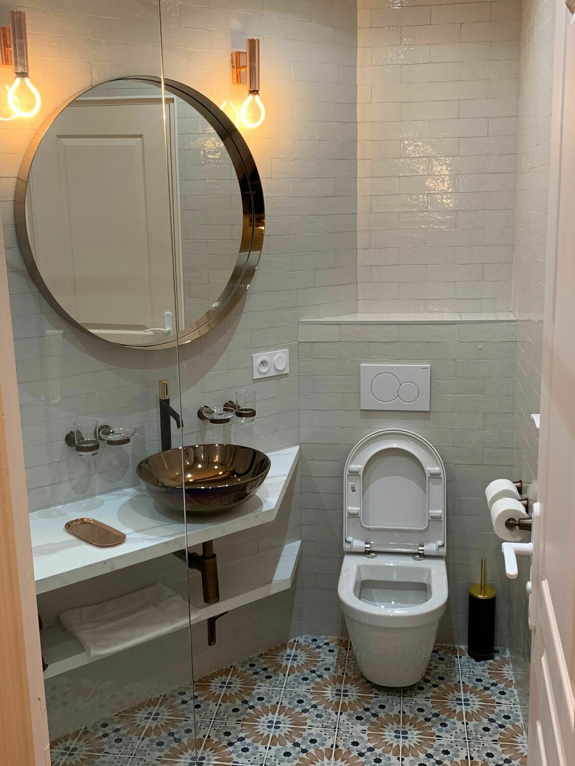 La salle de bain a une forme triangulaire, où on y trouve le lavabo élégant dans la couleur inhabituelle moka, ce qui a permis de mettre l'accent sur l'intérieur de cette micro salle d’eau.